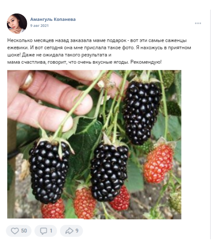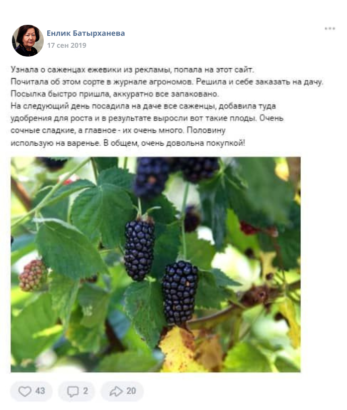 Наша семья создала ежевичное дерево – гибрид. Мы предлагаем уникальный сорт, проверенный временем и людьми! Конкуренты пытаются выдать свои саженцы за наши, поэтому сейчас на рынке много подделок. Наш сорт адаптирован под абсолютно все регионы Казахстана, где зима не холоднее -36 градусов.